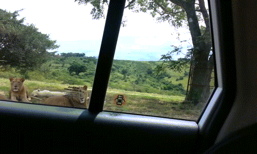 Đàn sư tử đang nằm dạo chơi thì xe ô tô tiến đến, một con sư tử đực trong đàn bạo dạn tiến đến cánh cửa, dùng hàm răng sắc nhọn của nó cắn lấy tay nắm và giật mạnh. Cửa xe không chốt nên bất thình lình cánh cửa bật tung làm cho người quay phim lúc bấy giờ nhìn ra bên ngoài với vẻ phấn khích cao độ giật mình hốt hoảng.