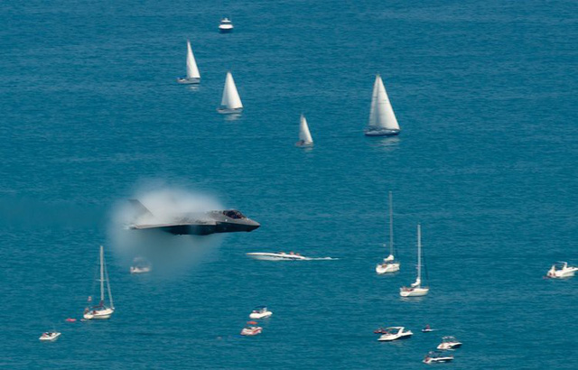 Máy bay F-35 bay qua hồ Michigan khi thực hiện màn trình diễn trên không. - Ảnh: Không quân Mỹ |