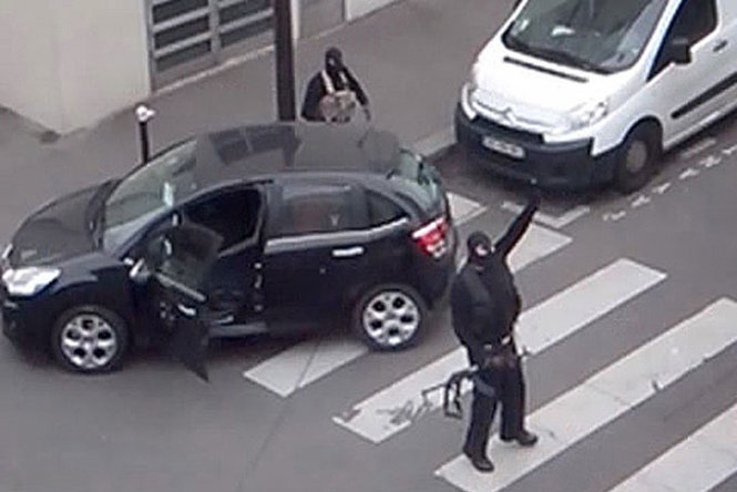 Theo tin tức trên Sky News, đoạn video cho thấy hai kẻ khủng bố bịt mặt bình thản trở về xe sau khi thực hiện vụ tấn công thảm sát tại tòa báo Charlie Hebdo.
