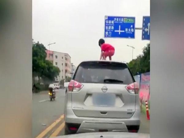 Từ cửa sổ trời của chiếc Nissan, một bé gái tóc ngắn đứng thò nửa người lên trên. Rồi khi xe đang dừng chờ đèn đỏ, cô bé trèo hẳn lên nóc xe đứng nhảy nhảy trước khi trèo lại vào trong xe.