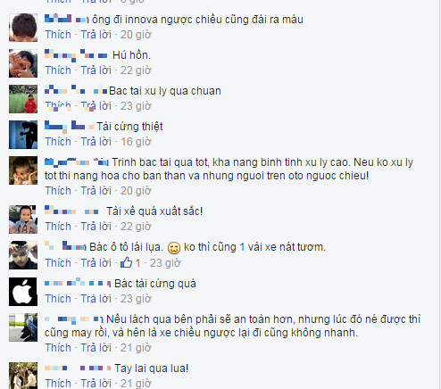 Facebooker Hung Nguyen bình luận: “Quá nguy hiểm”. Nickname Ngo Thuc Vu chia sẻ: “Trình bác tài quá tốt, khả năng bình tĩnh xử lý cao. Nếu không xử lý tốt thì mang họa cho bản thân và những người trên ô tô ngược chiều”.