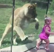 Một con sư tử lớn được nhìn thấy nằm trên tảng đá. Lúc này bé gái gần 1 tuổi đang chơi đùa bên ngoài lớp kính bảo vệ. Nhận thấy có sự di chuyển của bé gái, con sư tử lập tức sử dụng chiến thuật bắt mồi theo tự nhiên.
