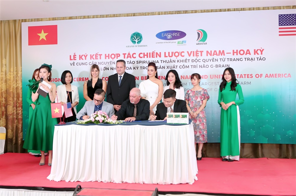 Vừa qua, sự kiện “Lễ ký kết hợp tác chiến lược Việt Nam- Hoa Kỳ về cung cấp nguyên liệu Tảo Spirulina thuần khiết, độc quyền từ trang trại Tảo lớn nhất Hoa Kỳ trong sản xuất cốm trí não G-Brain” đã được diễn ra thành công giữa đại diện của nhãn hàng cốm trí não G-Brain là ông Nguyễn Khánh Long và Mr. Christopher Lee - đại diện trang trại tảo lớn nhất Hoa Kỳ Earthrise.