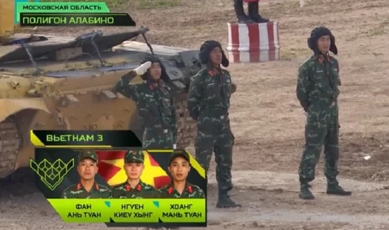 Kíp xe thứ ba của đội tuyển Việt Nam (VN3) gồm: Trưởng xe Nguyễn Kiều Hưng, pháo thủ Phan Anh Tuấn và lái xe Hoàng Mạnh Tuấn hôm qua tham gia lượt đấu cuối cùng trong vòng loại Giải đua xe tăng quốc tế Tank Biathlon 2019 với các đối thủ đến từ Cuba, Angola và Sudan tại thao trường Alabino, ngoại ô Moskva.