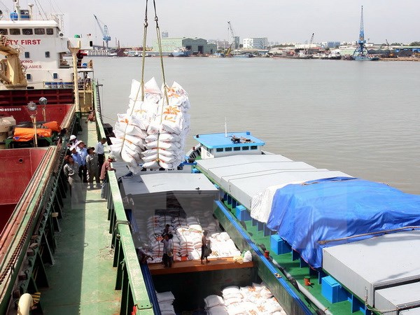Công ty bốc xếp xuất khẩu gạo tại cảng Công nghiệp tàu thủy (TP.HCM). (Ảnh: Đình Huệ/TTXVN) |