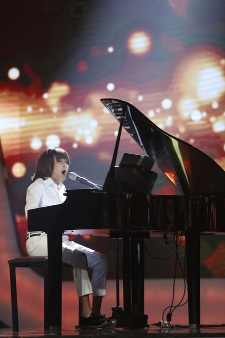 Tiếp tục khiến khán giả bất ngờ khi thể hiện một sở trường mới trong phần trình diễn ca khúc “Ca dao mẹ”, Thiên Khôi xuất hiện như một nghệ sĩ thực thụ bên chiếc đàn piano và cất giọng hát ấm áp và truyền cảm.