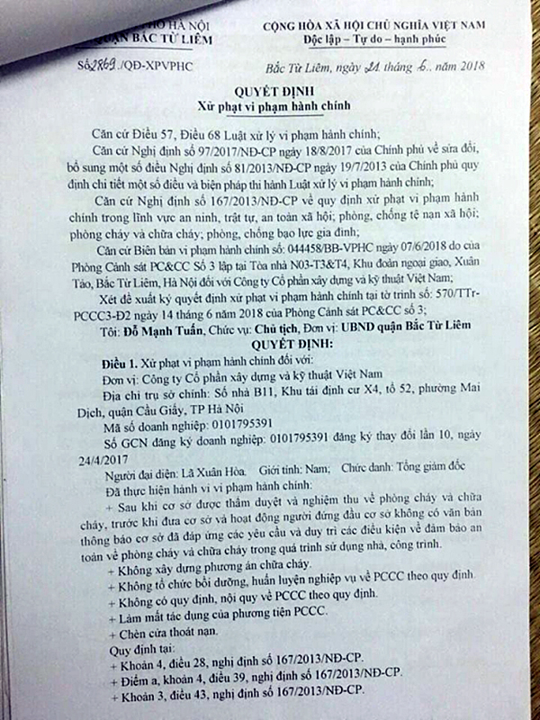 Quyết định xử phạt vi phạm hành chính của UBND quận Bắc Từ Liêm đối với hàng loạt vi phạm về PCCC của Công ty Vinaenco. |