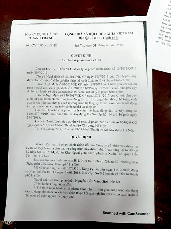 Tiếp đến ngày 31/8/2018, Sở Xây dựng Hà Nội đã ban hành Quyết định số 102/QĐ-XPVPHC, xử phạt vi phạm hành chính đối với Công ty Vinaenco.