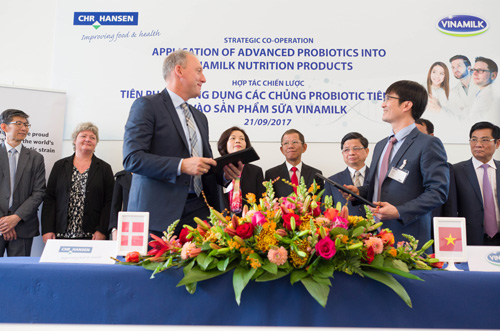 Ngày 21/9, Công ty cổ phần Sữa Việt Nam (Vinamilk) và Tập đoàn Chr. Hansen Đan Mạch đã ký kết Hợp tác chiến lược “Tiên Phong Ứng Dụng Các Chủng Probiotic Tiên Tiến Vào Sản Phẩm Sữa Vinamilk” tại trụ sở chính của tập đoàn tại Đan Mạch. Buổi Lễ ký kết có sự tham dự của ông Nguyễn Trường Thanh - Đại sứ đặc mệnh toàn quyền Việt Nam tại Đan Mạch, ông Phạm Thái Phương - Bí thư thứ II phụ trách về Quan hệ song Phương Việt Nam – Đan Mạch, đại diện lãnh đạo các đơn vị bộ ngành liên quan, đại diện lãnh đạo tập đoàn Chr. Hansen và Vinamilk.