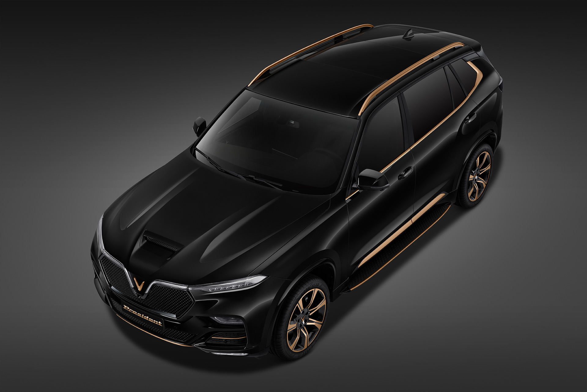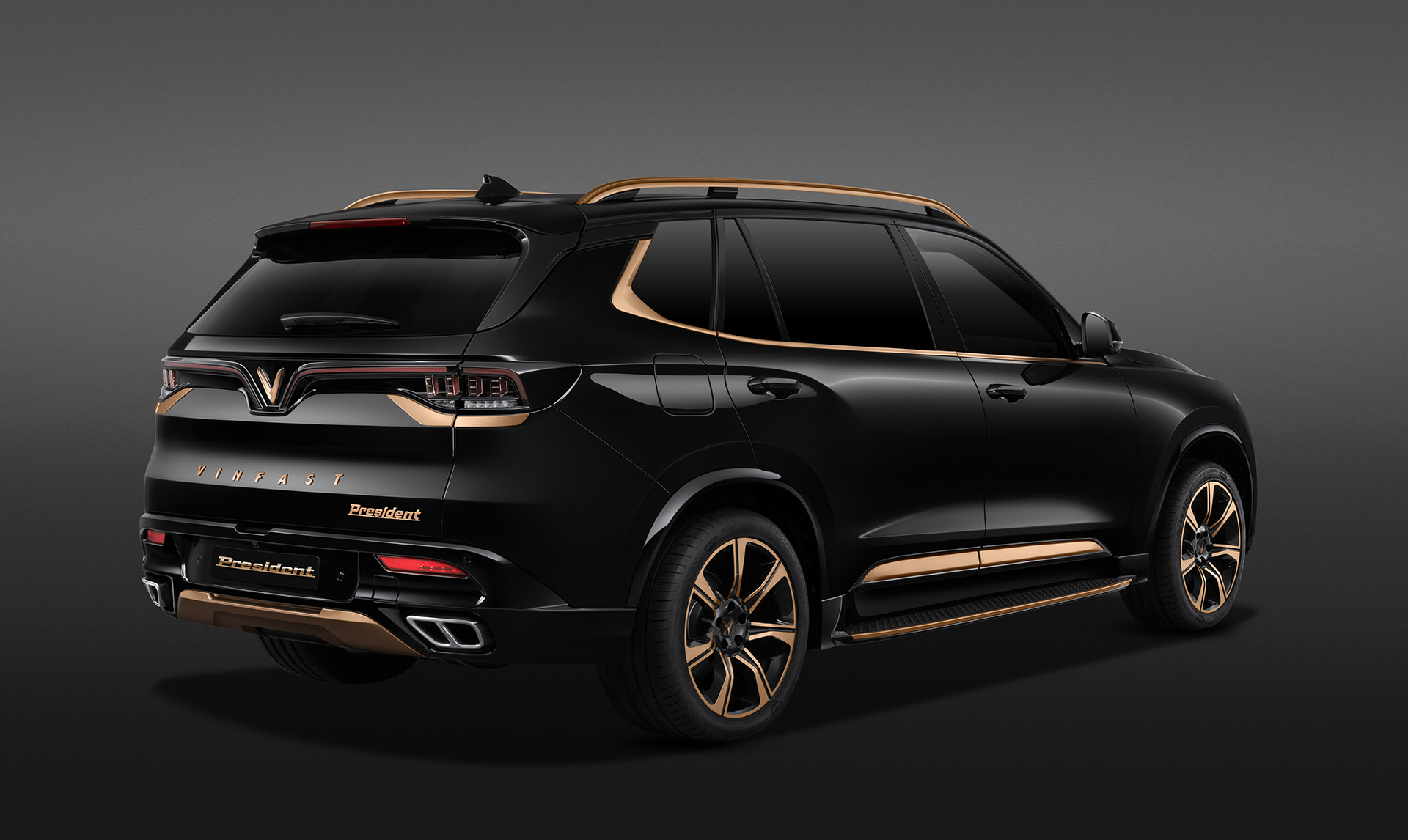 Đặc biệt, để phục vụ nhu cầu cá nhân hóa theo sở thích của từng chủ xe, VinFast President có tới 18 màu sơn ngoại thất, cùng các chi tiết tạo điểm nhấn có thể lựa chọn phủ màu vàng (Gold), đồng (Copper), xám (Gun Metal) hay bạc (Metallic Silver) trên logo, giá nóc, nẹp cửa, bậc lên xuống, la-zăng hay cản trước, cản sau.
