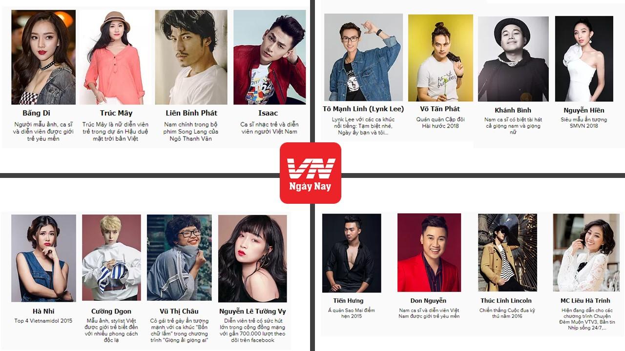 Bên cạnh đó, VN Ngày Nay còn nhận được sự đồng hành của các tài năng bước ra từ những chương trình truyền hình thực tế như ca sĩ Khánh Bình – chàng trai gây ấn tượng với khả năng hát cả giọng nam và giọng nữ một cách vô cùng mượt mà trong chương trình Người bí ẩn, chàng trai với thể lực cường tráng đã chiến thắng trong Cuộc đua kỳ thú 2016 Thúc Lĩnh Lincoln, Tiến Hưng – Á quân Sao mai điểm hẹn 2015 hay Võ Tấn Phát – Quán quân cặp đôi hài hước 2018.
