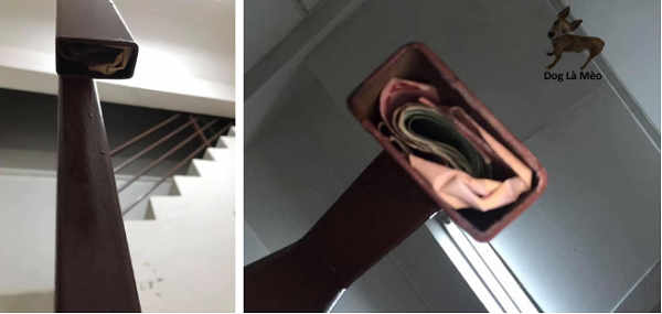 Hóa ra ông chồng đã âm thầm giấu quỹ đen bên trong tay vịn cầu thang. |