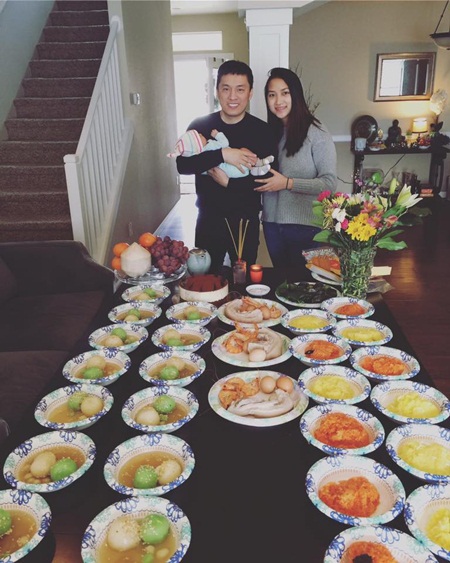 Trong ảnh, Yến Phương và Lam Trường ôm con gái nhỏ trong lòng đứng trước mầm cỗ cúng được chuẩn bị đầy đủ, đẹp mắt.