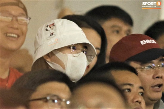 Viên Minh đeo khẩu trang kín mít, đội mũ và ngồi lẫn vào đám đông khán giả. Đây cũng là lần đầu tiên cô nàng lộ diện sau lễ đính hôn. |