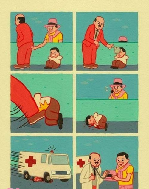 | Công bằng không dành cho kẻ yếu. Người đội mũ hồng đã “chơi xấu” người mặc áo cam. Tuy nhiên, ông áo cam lại tưởng cậu bé cụt tay ngồi phía sau làm chuyện đó, vì vậy ông xịt hơi cay khiến cậu bé bị tử vong. Thấy vậy, kẻ đội mũ hồng gọi cứu thương, nhưng không phải để cấp cứu cho nạn nhân mà chỉ để khám bệnh cho chiếc mũ mà thôi. |