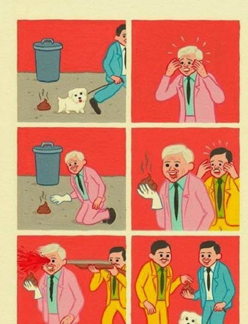Lòng tốt không phải lúc nào cũng được công nhận và biết ơn. Ngươì mặc áo vest xanh dắt chó đi dạo, nhưng cún con đã bất ngờ thải phân ra đường. Sau đó, người mặc vest hồng đi qua thấy ô nhiễm nên dọn bãi phân vào thùng rác nhưng vô tình người mặc áo vest vàng tưởng ông áo hồng nhặt được của không trả lại nên giết đối phương và trả lại ông áo xanh bãi phân với thái độ vô cùng vui vẻ. Bức ảnh cho thấy rằng có những điều chúng ta vứt bỏ sẽ gây ảnh hưởng đến môi trường xung quanh, thế nhưng khi người tốt có lòng giúp đỡ thì lại bị hiểu nhầm tai hại. |