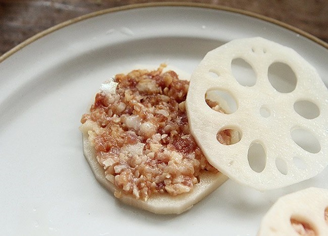 - Dùng hai lát củ sen có kích thước bằng nhau, cho nhân thịt vào giữa, dẹt nhân rồi ấn nhẹ một miếng củ sen khác lên trên nhân để tạo thành kẹp củ sen. Làm tương tự đến hết.