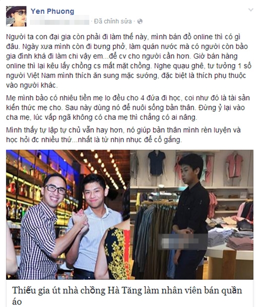 Đáp lại những lời soi mói của một số cư dân mạng, Yến Phương hôm 13/6 đã đăng lên tường facebook của cô một đường link bài viết “Thiếu gia út nhà chồng Hà Tăng làm nhân viên bán quần áo”, trong đó có bức ảnh em trai của Louis Nguyễn (chồng Tăng Thanh Hà) trực tiếp đứng bán quần áo. Kèm theo đường link, Yến Phương viết: