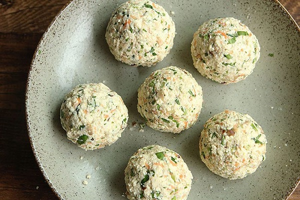 - Bóp nhỏ đậu phụ và cho vào bát, vắt bớt nước để dễ nặn tròn thành các viên.