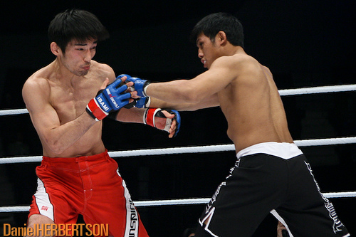 | Võ sỹ Nam Phan (trái) phải trong trận đấu với Kadowaki. |
