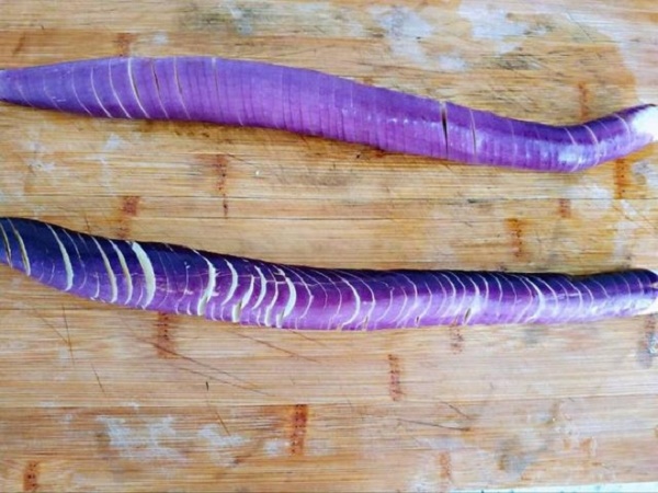 - Bước 1: Cà tím rửa sạch và thái thành từng khúc chéo với chiều dày khoảng 1/2 đốt ngón tay.