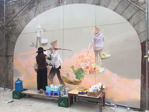 Những bức tranh đầu tiên được thực hiện bởi các nghệ sĩ Hàn Quốc mô tả lại không gian, con người Hà Nội xưa. Những vòm cầu này nằm gần ngã tư Phùng Hưng - Hàng Cót - Hàng Lược. |