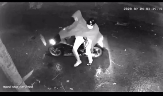 Theo camera an ninh ghi lại, sự việc xảy ra vào khoảng 3h30 ngày 24/9. Hai người đàn ông mặc áo mưa, đi xe máy đến trước cửa ông Hùng thì dừng lại.
