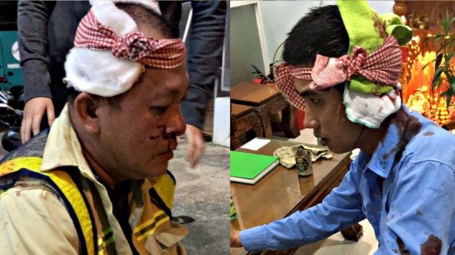 Ông Chánh (trái) và ông Phương sau khi bị hành hung. Ảnh: Thanh Niên |