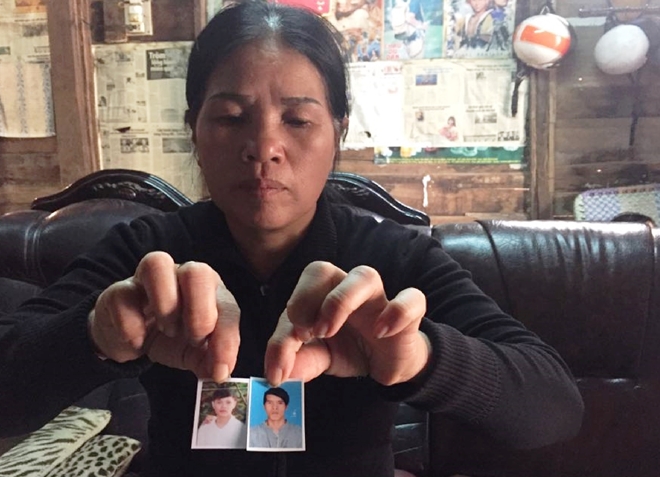 Bà Lý cùng với ảnh của hai người con trai bị “mất tích” bí ẩn. Ảnh: Báo Công an Nhân dân |