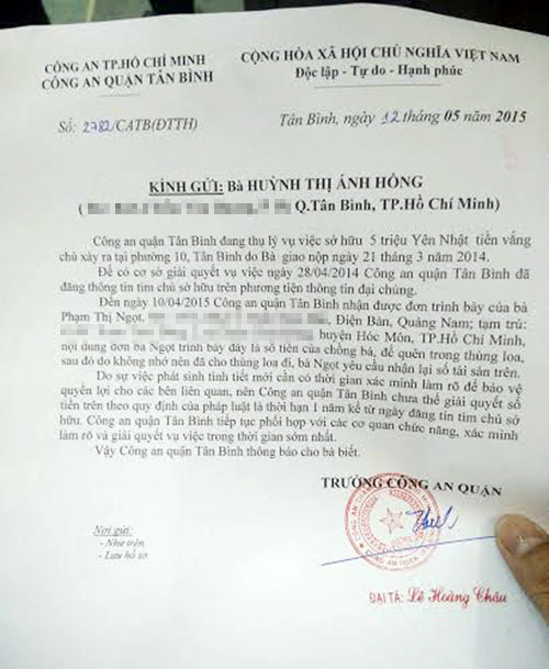 (ĐSPL) - Công an quận Tân Bình, TP.HCM đã có văn bản trả lời chị Hồng, người nhặt được 5 triệu yen trong chiếc loa thùng cũ cách đây hơn 1 năm.