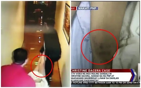 Trong đoạn clip mới này, khi Dacera được đưa ra khỏi phòng, đôi chân cô trông vẫn bình thường. Nhưng ảnh chụp được cảnh sát chia sẻ thì đôi chân của Á hậu Philippines lại có nhiều vết bầm tím.