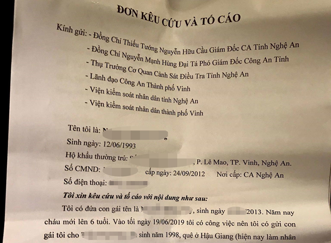 Trước đó, Tuổi Trẻ trích dẫn đơn tố cáo của gia đình anh N.T.T. thể hiện, tối 19/6 vì bận công việc nên anh T. đã gửi con gái 6 tuổi cho người phụ nữ tên là T.T.T.A. (21 tuổi, quê tỉnh Hậu Giang) trông. Người phụ nữ này sau đó đưa con gái anh T. đến một khách sạn tại TP Vinh.