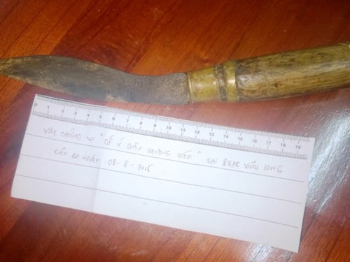 | Con dao mà Vân dùng để gây án, cắm sâu vào sọ não cháu bé 11 ngày tuổi. |