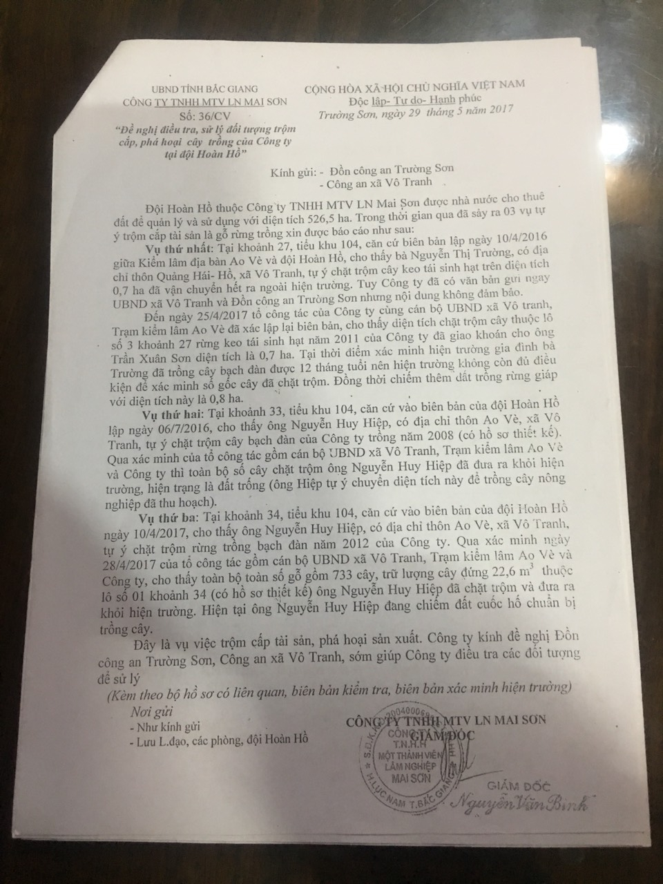 Công ty Lâm nghiệp Mai Sơn đã có Công văn đề nghị điều tra, xử lý đối tượng trộm cắp, phá cây trồng của Công ty tại đội Hoàn Hồ, thuộc phần đất đã giao cho ông Trần Xuân Sơn
