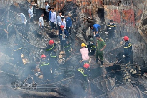 Lực lượng chức năng tiến hành khắc phục hậu quả sau vụ cháy chợ Gạo tại Hưng Yên. Ảnh: VietNamnet |
