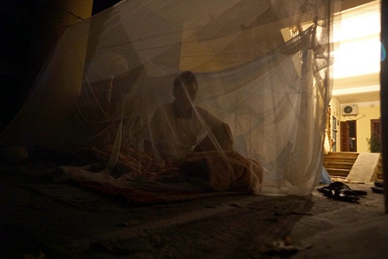 Người đàn ông chải vội chiếc chiếu xuống nền đất lạnh để có thể ngả lưng qua đêm phía sau bệnh viện. |