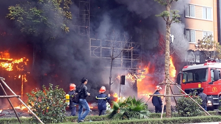 Lực lượng cứu hỏa nhanh chóng có mặt tại hiện trường để dập lửa ở khu vực số nhà 39-45 đường Trần Thái Tông. |