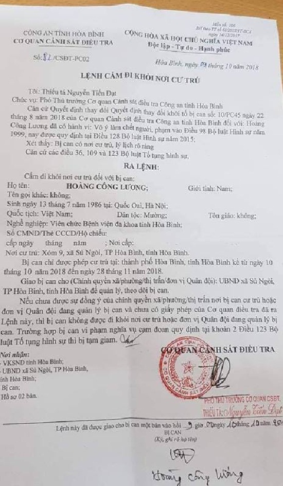 Cụ thể, theo lệnh cấm, bị can Hoàng Công Lương (cư trú tại xã Sủ Ngòi, TP.Hòa Bình) chỉ được phép cư trú tại TP. Hòa Bình, tỉnh Hòa Bình từ ngày 10/10/2018 đến ngày 28/11/2018; Giao bị can cho UBND xã Sủ Ngòi quản lý, theo dõi; Nếu chưa được sự đồng ý của chính quyền nơi bị can cư trú hoặc đơn vị quân đội đang quản lý bị can và chưa có giấy phép của cơ quan điều tra đã ra lệnh này thì bị can không được đi khỏi nơi cư trú. Nếu vi phạm thì sẽ bị tạm giam theo quy định tại khoản 2, điều 123 Bộ luật Tố tụng Hình sự.