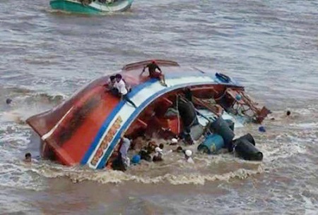 Chiếc tàu chở hàng chục người bị lật úp khi cách bờ vài trăm mét. (Ảnh: báo Vnexpress) |