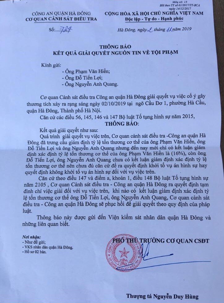 Theo đó, cơ quan CSĐT thông báo: “Quá trình giải quyết vụ việc trên, cơ quan CSĐT- Công an quận Hà Đông đã trưng cầu giám định tỷ lệ tổn thương cơ thể của ông Phạm Văn Hiển, ông Đỗ Tiến Lợi và ông Nguyễn Anh Quang. Nhưng đến nay, mới chỉ có kết quả giám định, xác định tỷ lệ tổn thương cơ thể của ông Phạm Văn Hiển là 16%, còn ông Đỗ Tiến Lợi, ông Nguyễn Anh Quang chưa có kết luận giám định xác định tỷ lệ tổn thương cơ thể nên chưa đủ căn cứ để ra quyết định khởi tố vụ án hình sự hay quyết định không khởi tố vụ án hình sự đối với vụ việc trên… Công an quận Hà Đông ra quyết định tạm đình chỉ việc giải quyết đối với vụ việc trên. Khi nào có kết luận giám định xác định tỷ lệ tổn thương cơ thể ông Đỗ Tiến Lợi và ông Nguyễn Anh Quang, cơ quan CSĐT- Công an quận Hà Đông sẽ phục hồi để giải quyết theo quy định của pháp luật”.