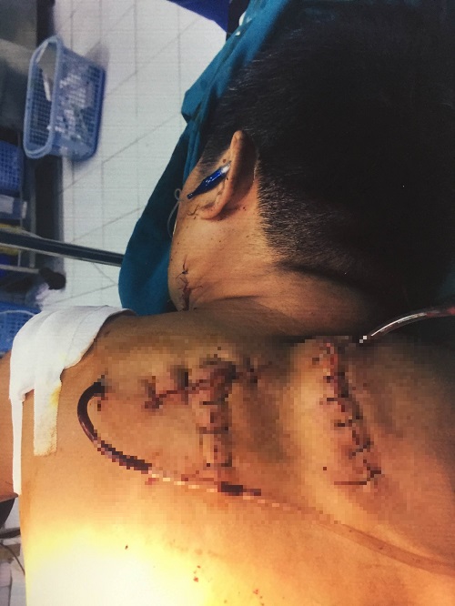 Sẹo vùng cổ- góc hàm trái: 2%; 2 sẹo vùng cổ sau bên phải, mỗi sẹo: 1%; Sẹo bả vai kèm theo sẹo dẫn lưu: 3%; 2 sẹo bả vai trái, mỗi sẹo 2%; Sẹo dẫn lưu bả vai trái: 1%; Sẹo mỏm vai trái: 1%; Sẹo lưng trái kèm sẹo dẫn lưu: 3%; Sẹo mặt sau cánh tay trái: 1%.