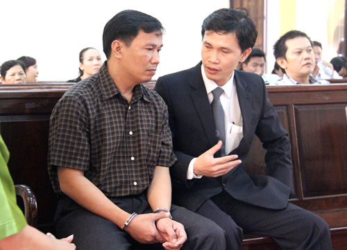 Vinh trao đổi với luật sư trước phiên xử. Ảnh: Báo Vnexpress |