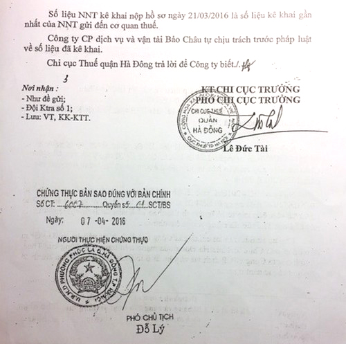 Theo văn bản số 676/C46-P9, ngày 19/4/2016 của Cục Cảnh sát điều tra tội phạm về kinh tế và tham nhũng – Bộ Công an thì “Hàng năm, chi cụ thuế Hà Đông đã lập các đoàn kiểm tra, thực hiện kiểm tra thuế tại công ty CP dịch vụ và vận tải Bảo Châu đều xác định tính chính xác số liệu về doanh thu 03 năm không thay đổi so với doanh thu kê khai tại các báo cáo tài chính” (Từ năm 2012 đến năm 2014).