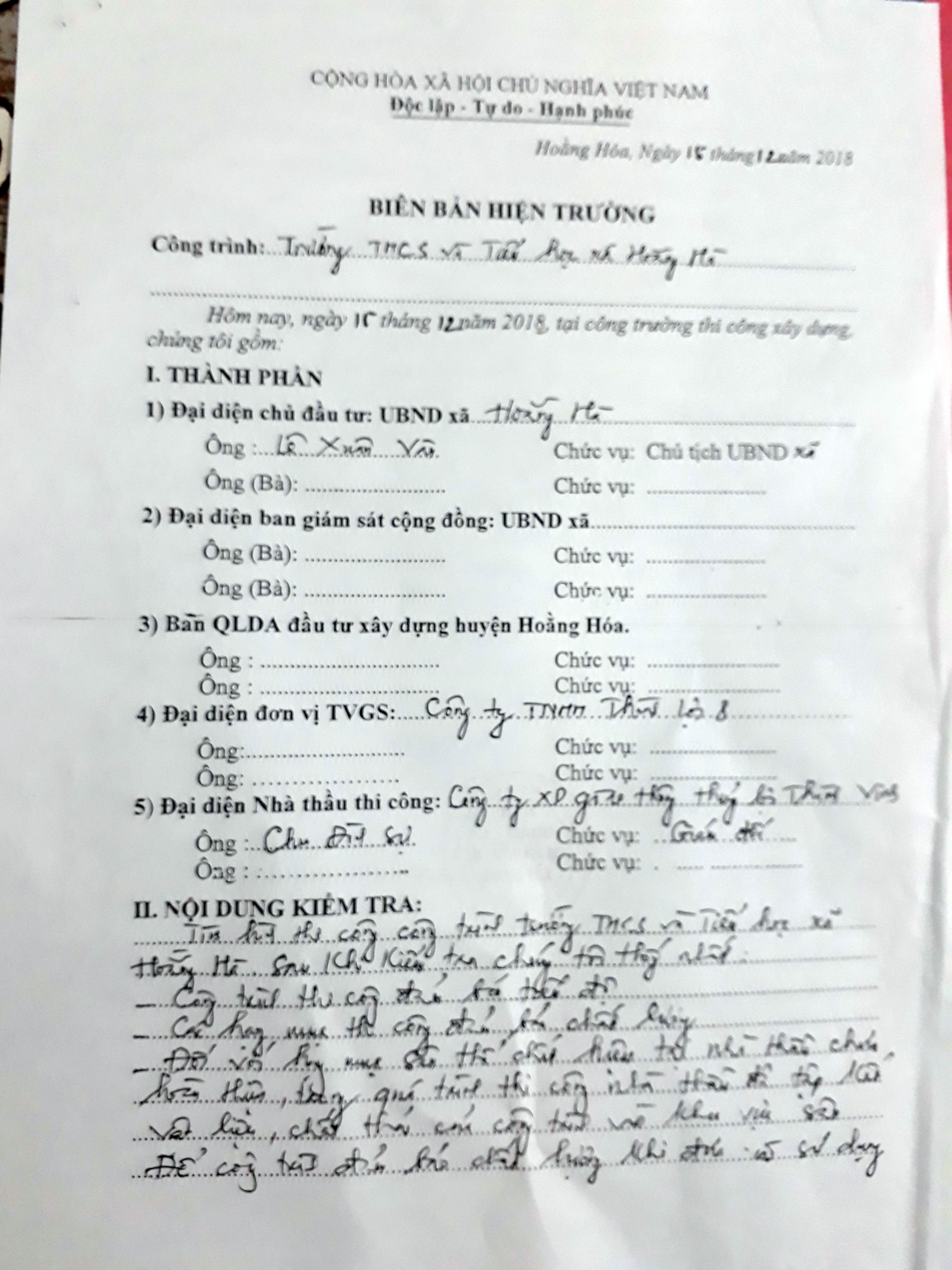 Cũng liên quan đến vụ việc trên, ngày 15/12/2018 đại diện UBND xã Hoằng Hà (chủ đầu tư), Công ty TNHH Thành Lợi 8 (đơn vị tư vấn giám sát), Công ty xây dựng giao thông thủy lợi Thành Vinh (nhà thầu thi công) đã có buổi kiểm tra hiện trường Công trình trường THCS và Tiểu học xã Hoằng Hà.