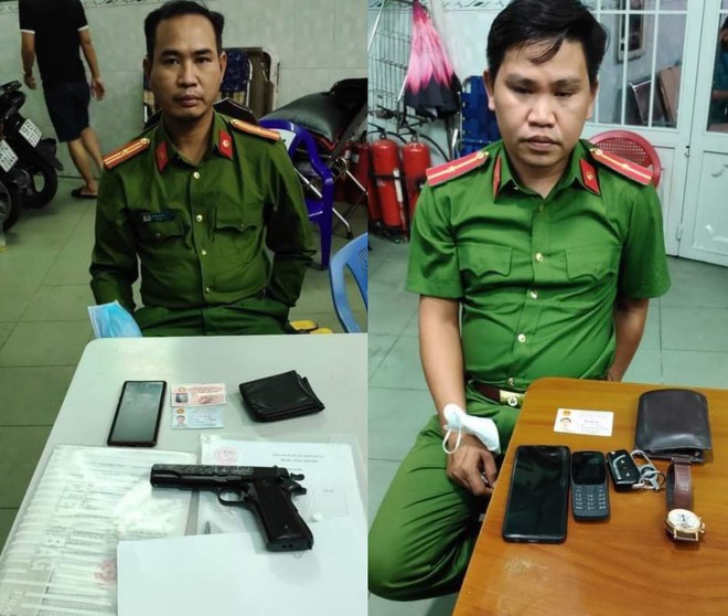 Tại trụ sở công an, cả 2 thừa nhận mua quân phục, súng ngắn và biển số xe trên mạng rồi giả làm cảnh sát.