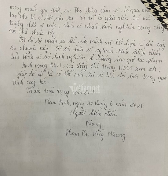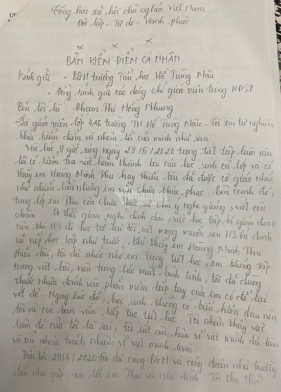 Bên cạnh đó, cô Phạm Thị Hồng Nhung cũng tự nhận trong bản tường trình là giáo viên trẻ mới ra trường được 2 năm nên chưa có nhiều kinh nghiệm trong công tác chủ nhiệm lớp dẫn đến sự việc. Qua đó, bày tỏ mong muốn gia đình em T. thông cảm, bỏ qua và cho mình cơ hội sửa sai.