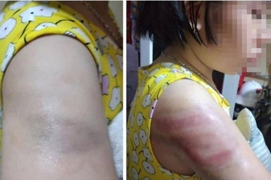 Học sinh bị cô giáo dùng thước nhựa đánh tím bầm bắp tay. Ảnh: Tiền Phong |