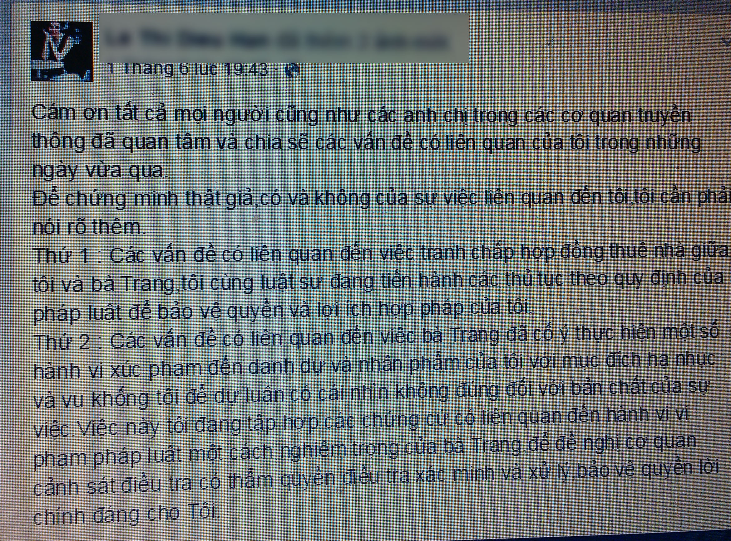 Để chứng minh thật giả, có và không của sự việc, tôi cần phải nói rõ thêm. Thứ nhất: Các vấn đề liên quan đến việc tranh chấp hợp đồng thuê nhà với bà Tr., tôi đang cùng luật sư tiến hành các thủ tục theo quy định của pháp luật, để bảo vệ quyền và lợi ích hợp pháp cho riêng mình. Thứ hai: Các vấn đề có liên quan đến việc bà Tr. cố ý thực hiện một số hành vi xúc phạm đến danh dự, với mục đích hạ nhục, và vu khống tôi, để dư luận có cái nhìn không đúng đối với bản chất của sự việc. Chuyện này tôi đang tập hợp các chứng cứ có liên quan đến hành vi vi phạm pháp luật một cách nghiêm trọng của bà Tr., để đề nghị cơ quan CSĐT có thẩm quyền xác minh và xử lý”.