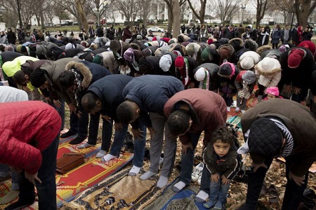 Hàng trăm người Hồi giáo trải thảm cầu nguyện tại công viên trước Nhà Trắng - Ảnh: EPA. |