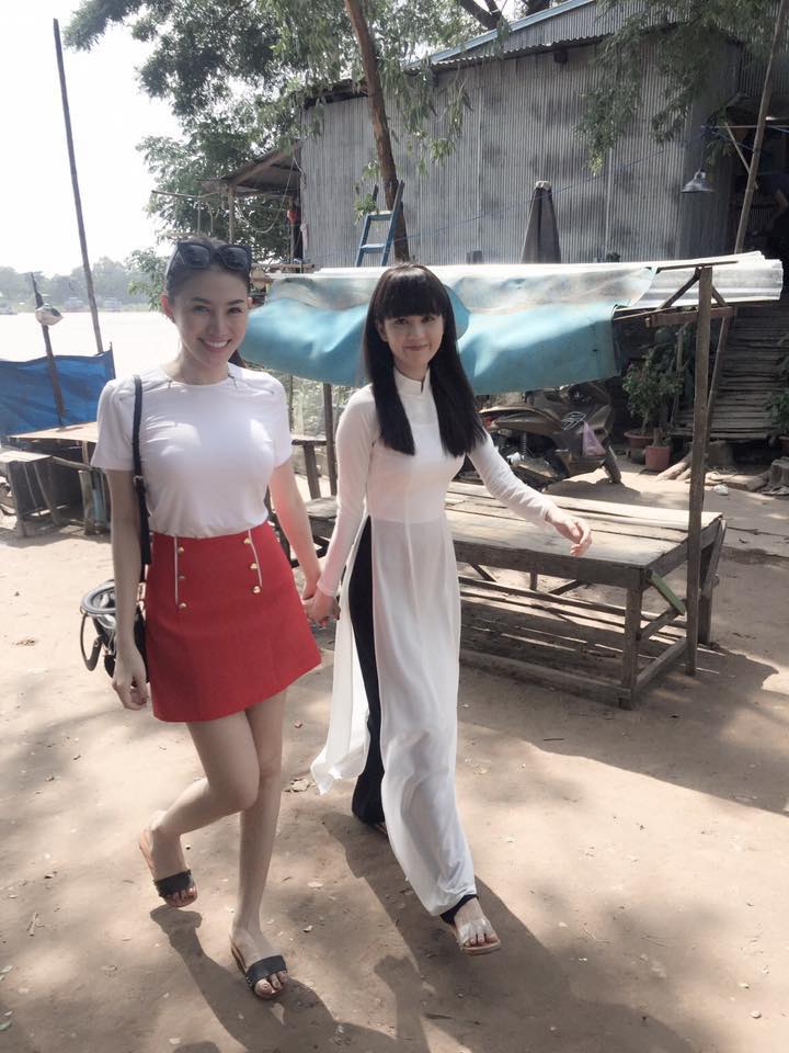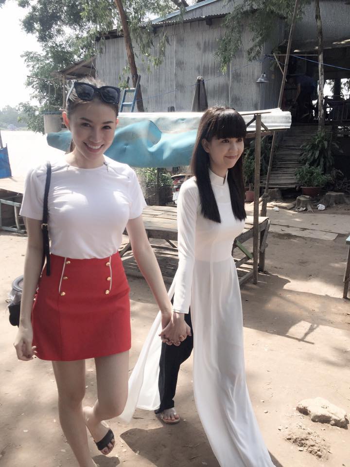 Ngọc Trinh thân thiết cùng Hà Lê tại hậu trường. |
